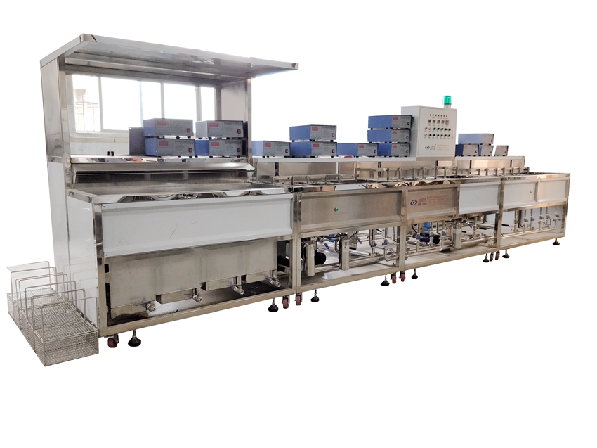 該清洗機主要由超聲波發生器、換能器、清洗槽、儲液槽、循環過濾系統、自動恒溫加熱系統、拋動系統、抽氣罩、冷水機、機架、電控柜等組成。